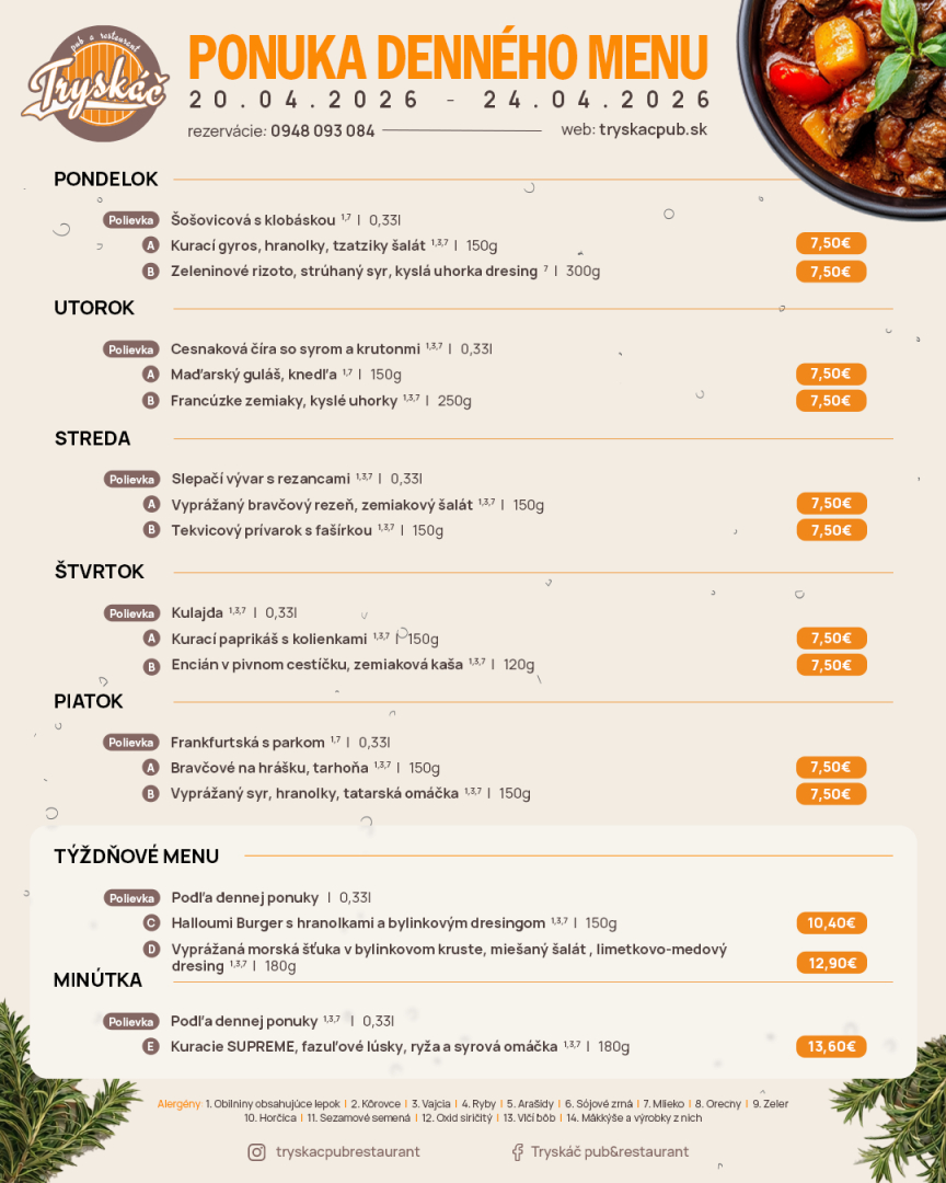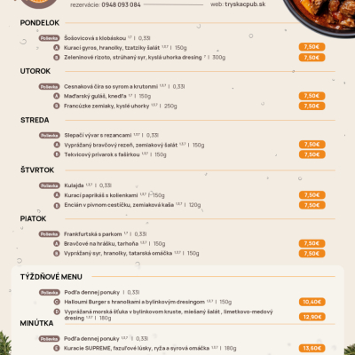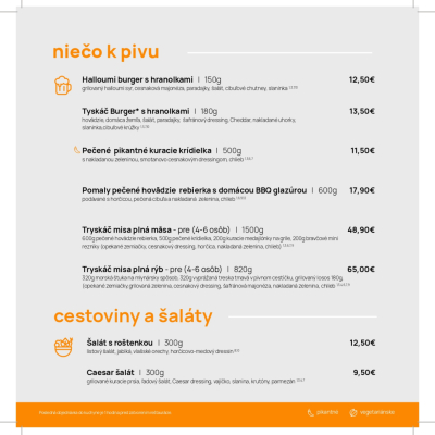 Tryskáč ponúka vynikajúce jedlo, správne napenené pivo alebo kvalitné víno. Do sýtosti sa tu najedia mäsožrúti, ale aj milovníci rýb či šalátov.