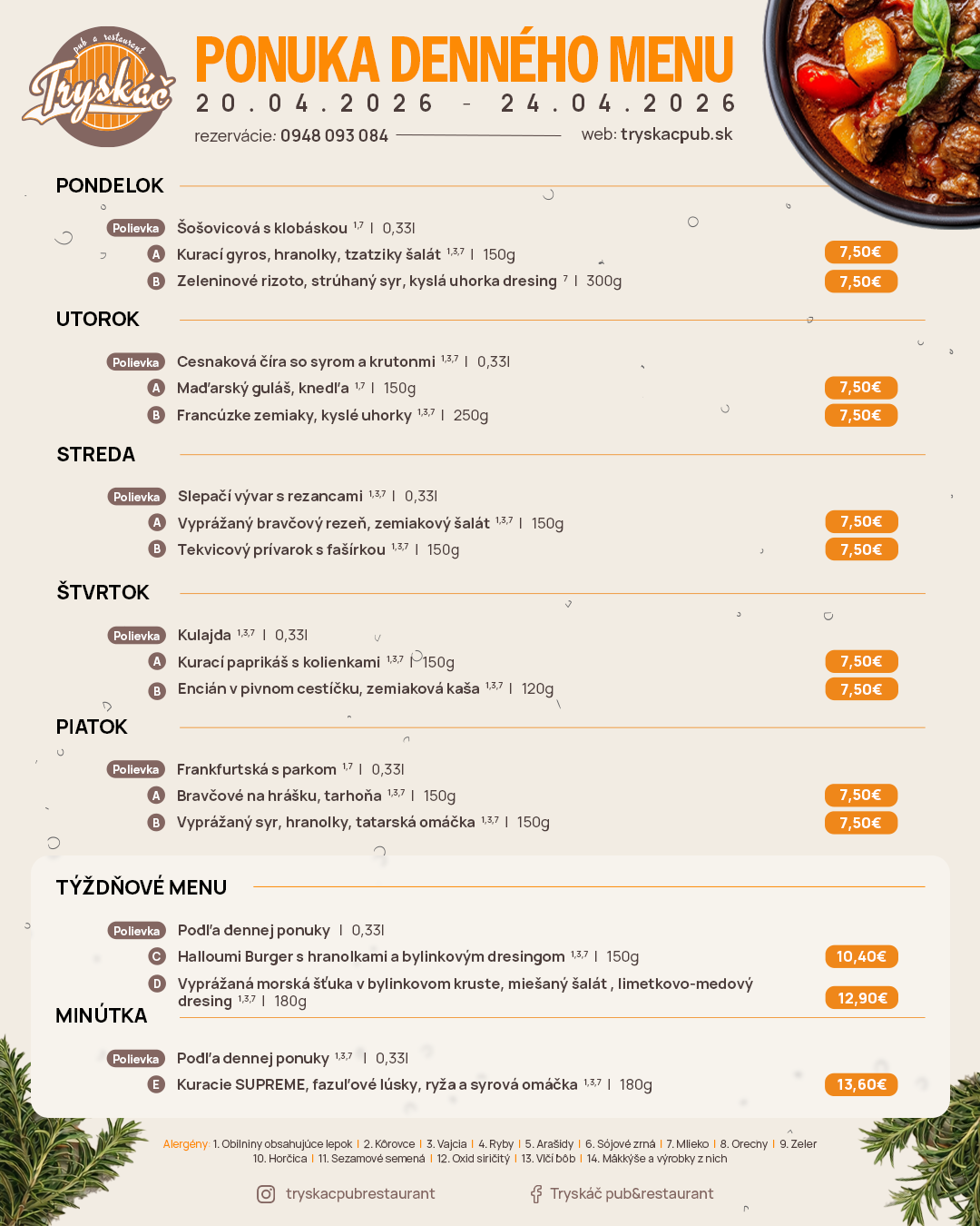 E: 180g Kuracie SUPREME, fazuľové lúsky, ryža a syrová omáčka (1,3,7) 12,90€