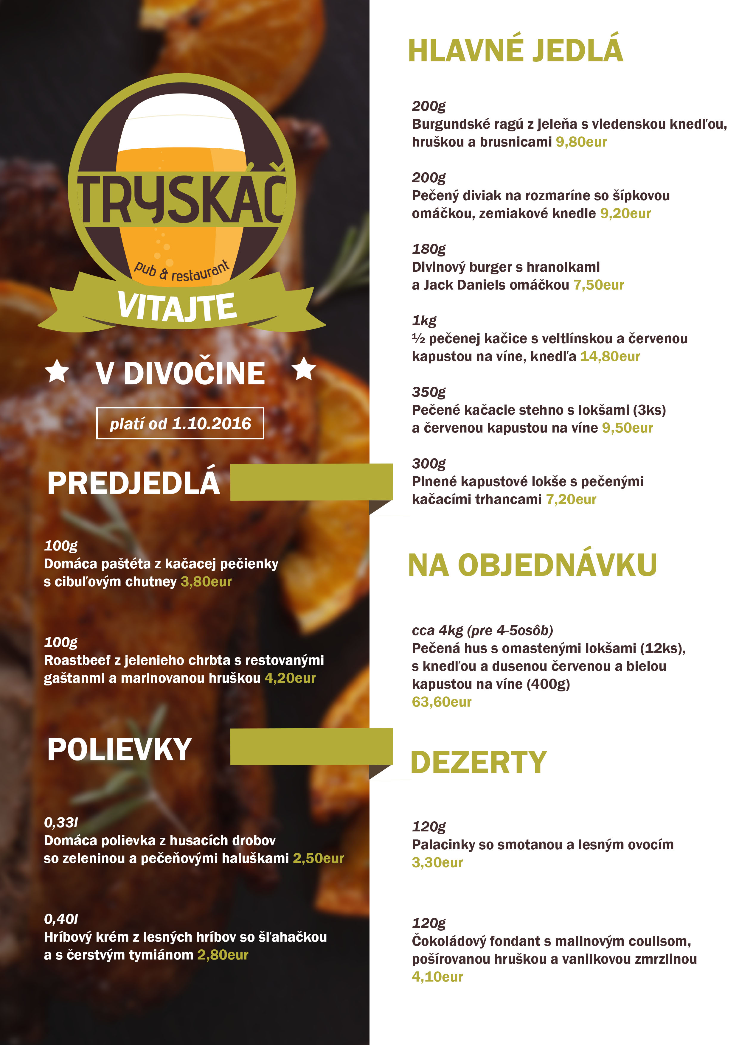 Tryskáč ponúka vynikajúce jedlo, správne napenené pivo alebo kvalitné víno. Do sýtosti sa tu najedia mäsožrúti, ale aj milovníci rýb či šalátov.
