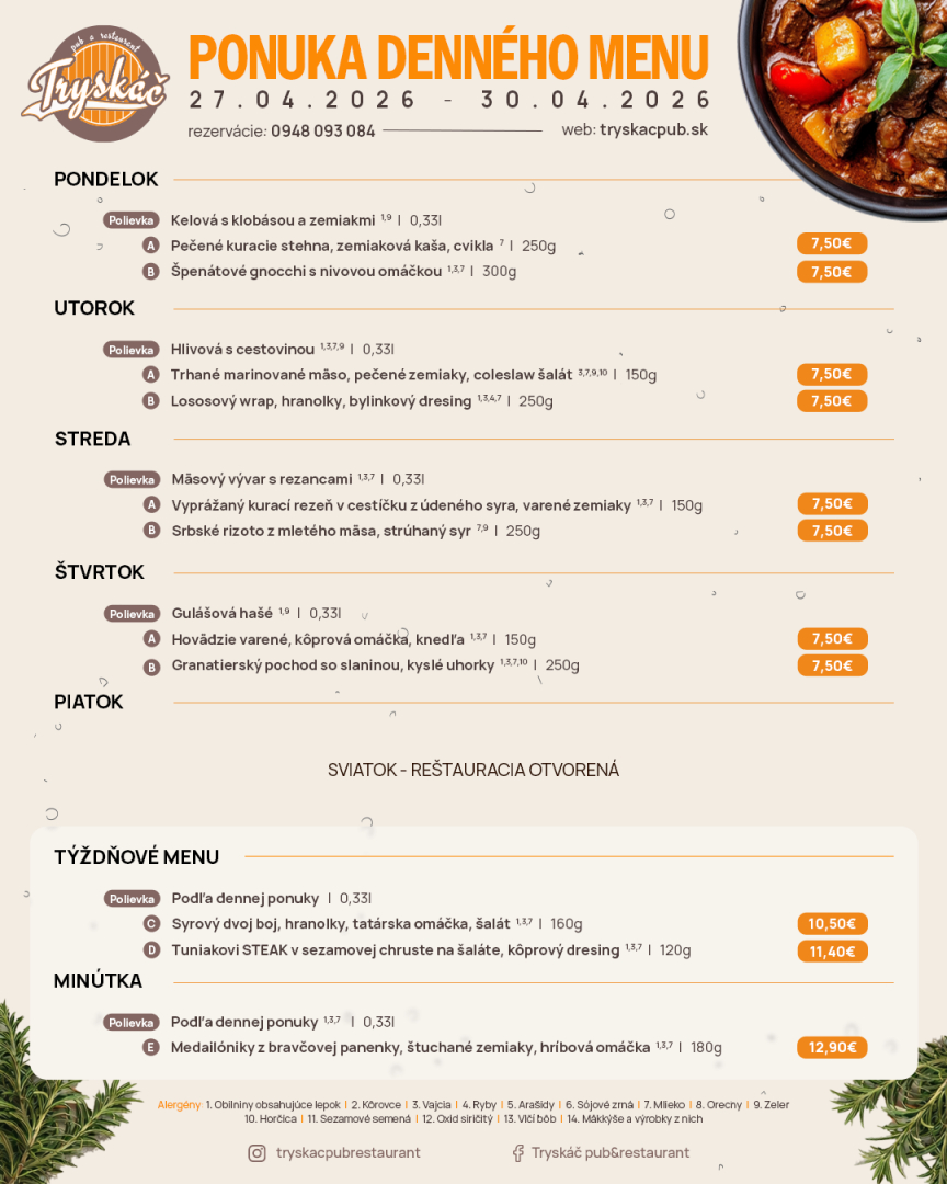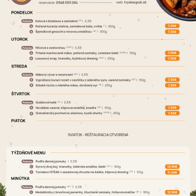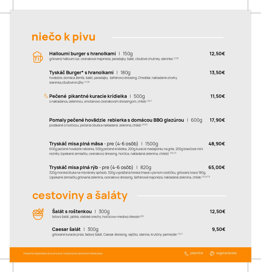 Tryskáč ponúka vynikajúce jedlo, správne napenené pivo alebo kvalitné víno. Do sýtosti sa tu najedia mäsožrúti, ale aj milovníci rýb či šalátov.